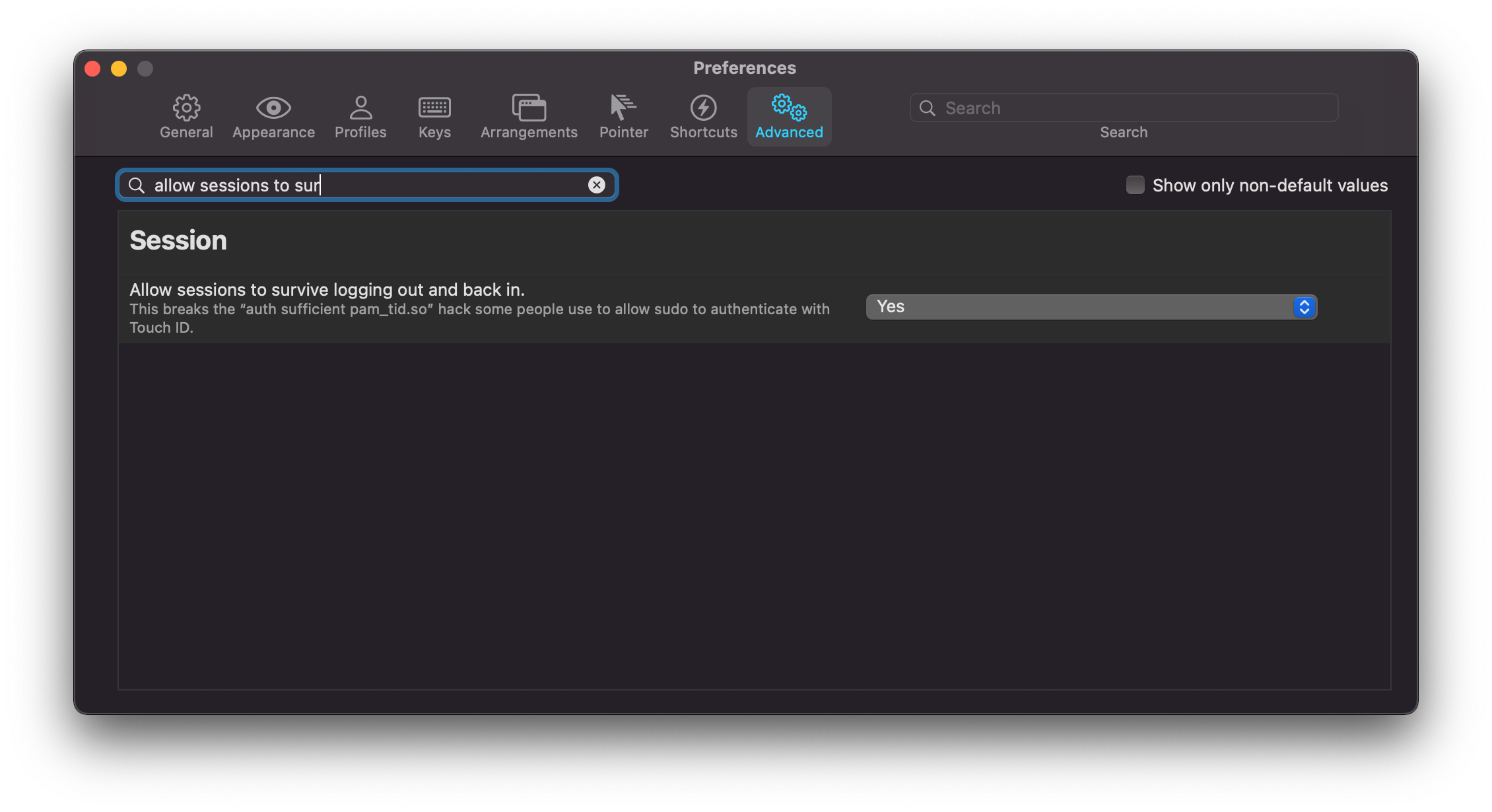 打开 iTerm 2 的偏好设置,选择高级,将「Allow sessions to survive logging out and back in」设置为「Yes」